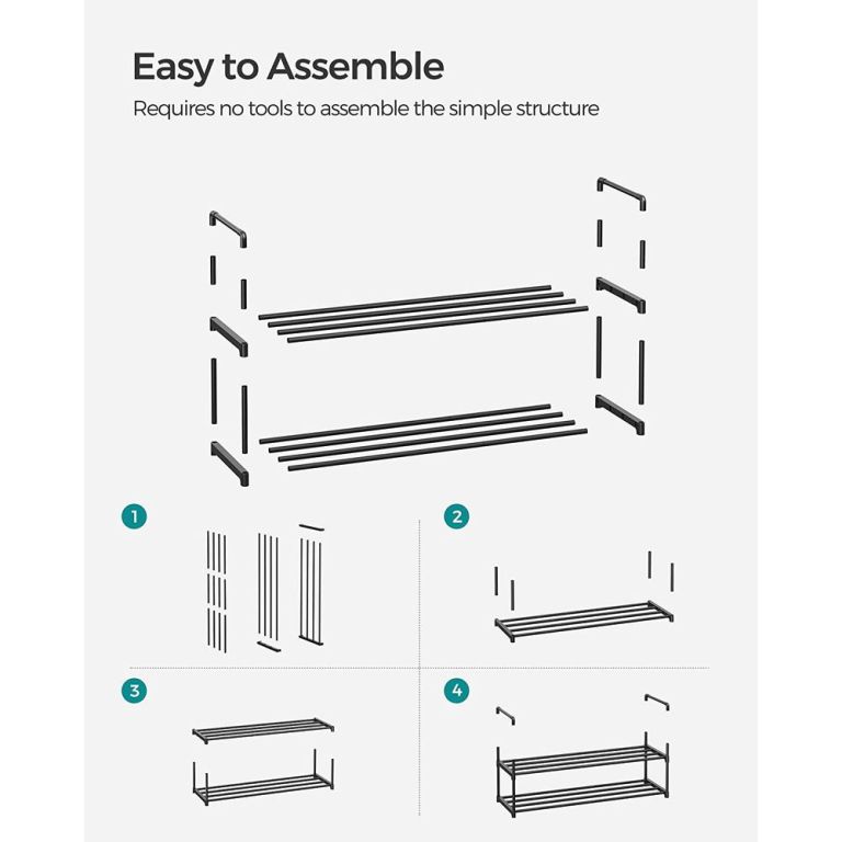 Praktický kovový stojan SONGMICS na 8–10 párů bot, snadná montáž bez nářadí a elegantní design do předsíně či ložnice.