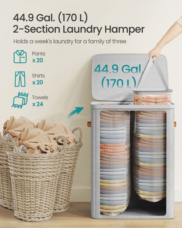 SONGMICS Koš na prádlo je ideálním řešením pro každou domácnost. Díky dvěma samostatným přihrádkám s označením "Světlé" a "Tmavé" rychle roztřídíte prádlo a zjednodušíte si praní. Koš má kapacitu 170 litrů, což vystačí pro týdenní dávku prádla pro rodinu až tří osob. Díky praktickému víku a odnímatelným taškám zůstane prádlo chráněné a vaše domácnost uklizená.