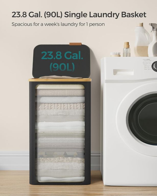 Stylový 90L koš na prádlo SONGMICS s víkem, bambusovými úchyty a vyjímatelnou vložkou usnadní každodenní třídění i praní.