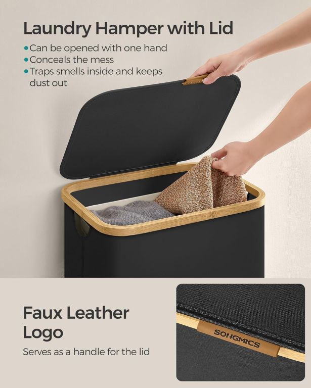 Zobrazit podrobnější popisStylový 90L koš na prádlo SONGMICS s víkem, bambusovými úchyty a vyjímatelnou vložkou usnadní každodenní třídění i praní.