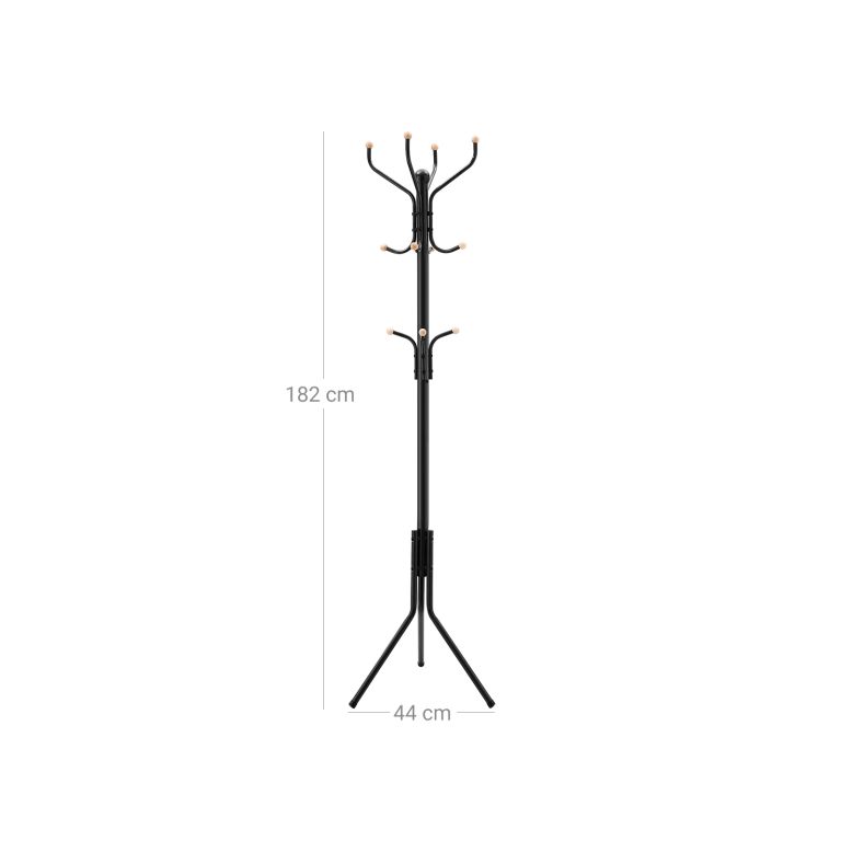 Hledáte elegantní a přitom praktické řešení pro uspořádání oblečení, tašek či klobouků? Kovový věšák SONGMICS s výškou 182 cm je ideální volbou do předsíně, ložnice, kanceláře nebo hotelu. Jeho moderní černé provedení a dřevěné koncovky háčků chrání oděvy před poškozením a dodávají nadčasový vzhled.