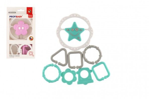Souprava řetězu a chrastítka v barevné kombinaci. Stimuluje smysly sluchu, zraku i hmatu dítěte a zároveň se cvičí uchopovací reflex.