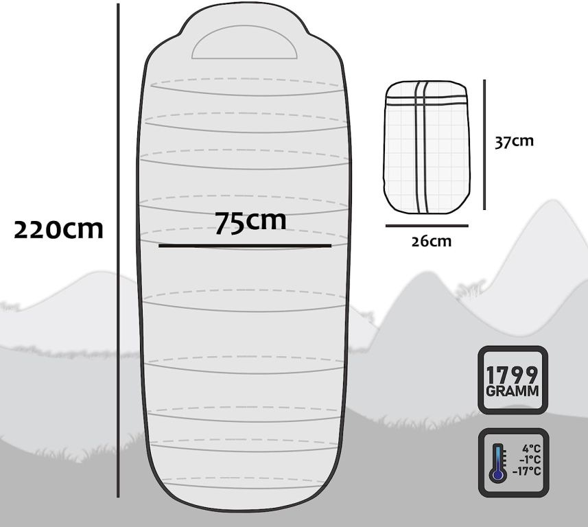Odolný polyesterový materiál je voděodolný, větruodolný a nepropustný. Spací pytel je vybaven dvoucestným zipem, integrovanou kapsou na cennosti a kompresním vakem pro snadné balení. Vhodný pro teploty až do -17 °C, snadno se udržuje a díky kvalitnímu zpracování vydrží i náročné podmínky.