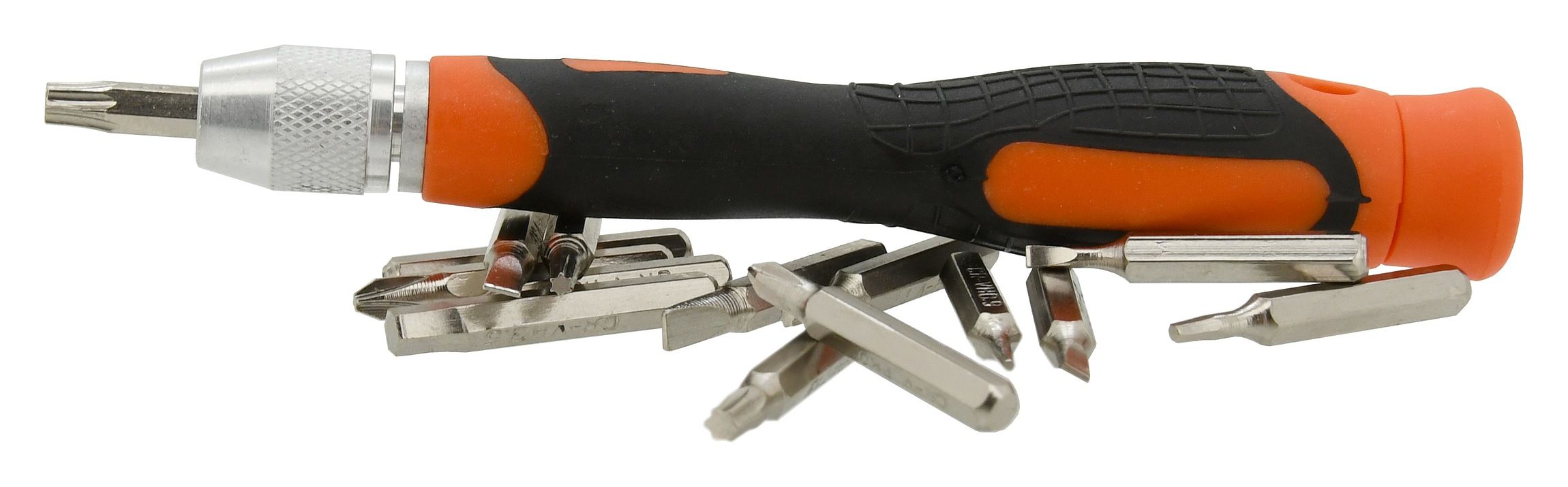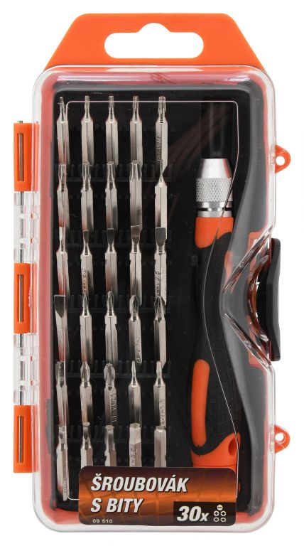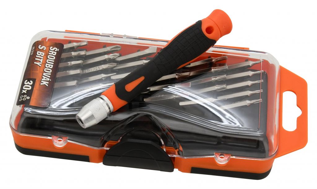 Sada praktického šroubováku s celou řadou drobných, nejběžněji používaných bitů. Tělo plastového šroubováku bylo pogumováno, což zabezpečuje výtečnou ergonomii a zajišťuje také, že šroubovák neprokluzuje ve dlani. Vrchní část je opatřena otočnou čepičkou, čímž výrazně usnadňuje šroubování.