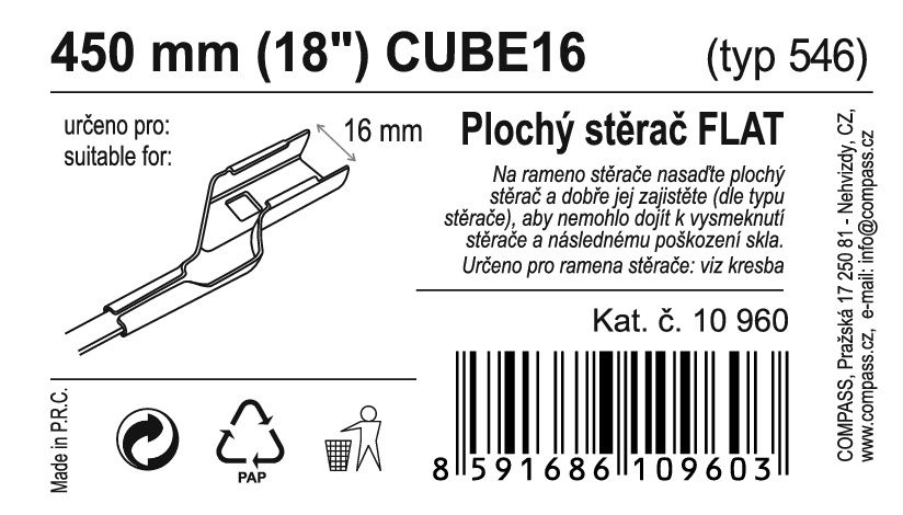 Stěrač je balen pouze v papírovém obalu „papper roll", ze kterého je možné stěrač jednoduše vyndat (prohlédnout si jej, vyzkoušet), a případně jej vrátit zpět do obalu. Každé balení stěrače je opatřeno štítkem s označením (včetně délky, čárového kódu i vyobrazení typu ramínka, na který jej lze použít). Nejdůležitějším faktorem kvality všech plochých stěračů je zpracování kovového pružného členu. Ten pružný člen má zásadní vliv na kvalitu stírání a životnost stěrače. Stěrače Compass jsou vždy osazovány vysoce kvalitním pružným členem.