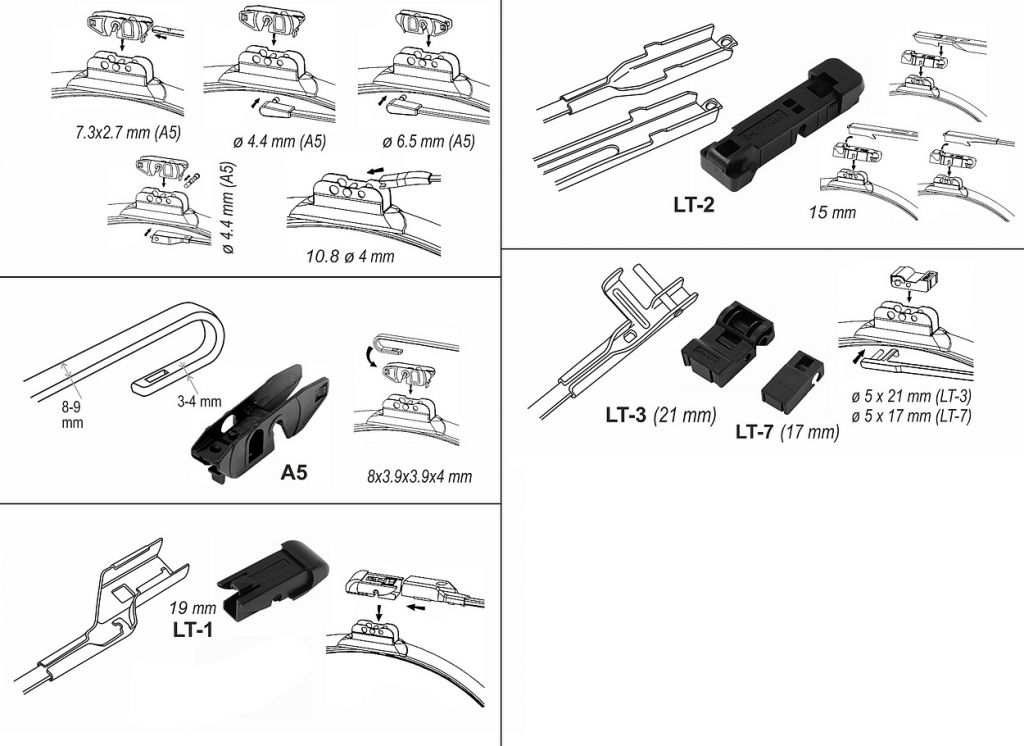 Speciální uchycení, díky kterému lze pomocí přiložených adaptérů použít tento stěrač pro řadu různých zakončení ramen stěračů. Balení jednoko kusu strače je ve speciálním "otevíracím" blisteru. Gumičku s černým grafitem lze vyměnit.