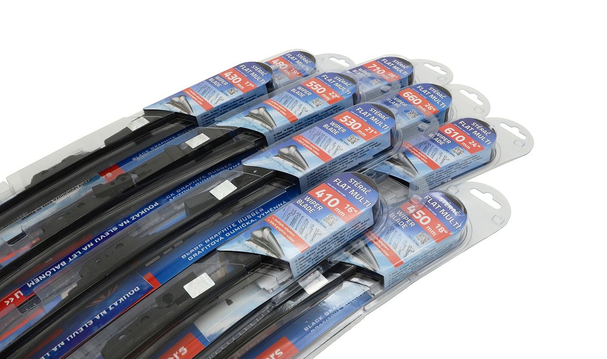 Plochý stěrač nové konstrukce, který zajišťuje důkladné a rovnoměrné stírání. Tento typ plochého stěrače je osazen gumičkou s černým grafitem.