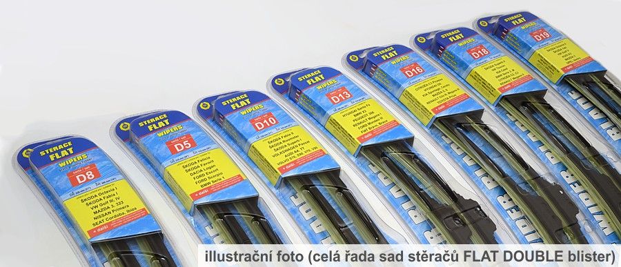 Sady dvou plochých stěračů FLAT (řidič + spolujezdec) s řadou adaptérů pro různá zakončení ramen stěračů. Dopřejte si pro jistotu zásobu stěračů.