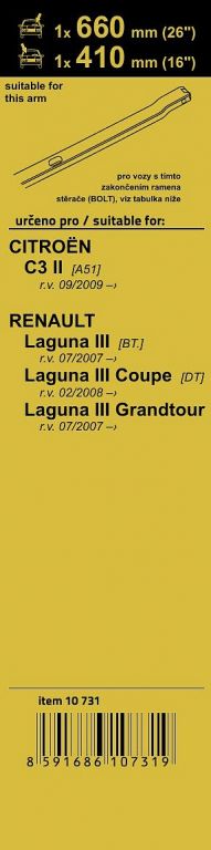 Sada dvou plochých stěračů typu Flat (řidič + spolujezdec) se speciálním uchycením. Dopřejte si zásobu těchto kvalitních stěračů. Délky stěračů a systém uchycení na ramínko jsou přizpůsobeny těmto vybraným vozům - Citroën C3 II [A51] 09/09, Renault Laguna III [BT.] 07/07, Renault Laguna III Coupe [DT.] 02/08, Renault Laguna III Grandtour [KT.] 07/07 -