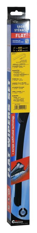 Sada dvou plochých stěračů FLAT (řidič + spolujezdec) se speciálním uchycením. Délky stěračů a systém uchycení na ramínko jsou přizpůsobeny vybraným vozům (viz tabulka použití). Vysoce kvalitní pružný člen plochého stěrače zajišťuje stejnoměrný tlak grafitového břitu v celé jeho délce.