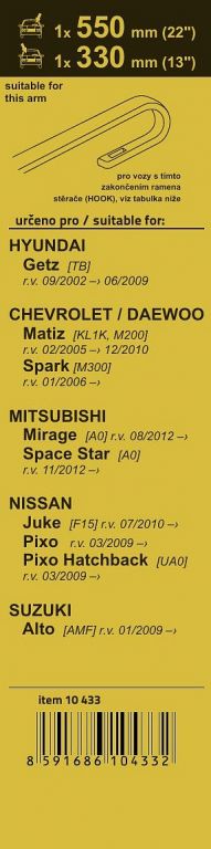 Délky stěračů a systém uchycení na ramínko jsou přizpůsobeny vybraným vozům (viz tabulka použití). Vysoce kvalitní pružný člen plochého stěrače zajišťuje stejnoměrný tlak grafitového břitu v celé jeho délce, což zamezuje rozmazávání nečistot a vytváření pruhů.