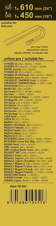 Délky stěračů a systém uchycení na ramínko jsou přizpůsobeny vybraným vozům (viz tabulka použití). Vysoce kvalitní pružný člen plochého stěrače zajišťuje stejnoměrný tlak grafitového břitu v celé jeho délce, což zamezuje rozmazávání nečistot a vytváření pruhů.