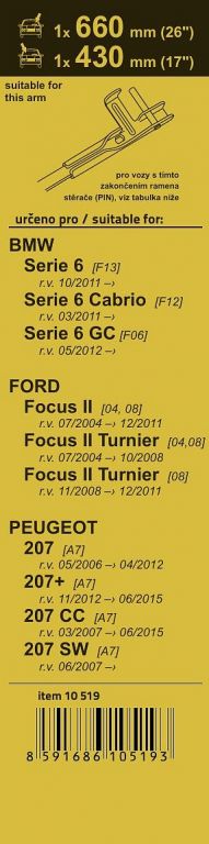 Délky stěračů a systém uchycení na ramínko jsou přizpůsobeny vybraným vozům (viz tabulka použití). Vysoce kvalitní pružný člen plochého stěrače zajišťuje stejnoměrný tlak grafitového břitu v celé jeho délce, což zamezuje rozmazávání nečistot a vytváření pruhů.