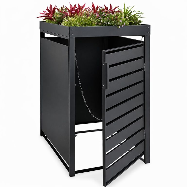 Skříň STILISTA pro odpadové nádoby nabízí prostor pro jeden odpadkový koš o objemu až 240 litrů. Díky přihrádkám na rostliny na střeše boxu na odpadky si jej můžete zkrášlit podle svých představ. Odtokové otvory na střeše pro rostliny umožňují lepší odtok vody, takže květinám a bylinkám nehrozí podmáčení. Užitečné větrací štěrbiny umožňují cirkulaci vzduchu a zabraňují vzniku nepříjemných pachů v krytu. Skříň na odpadové nádoby je k dispozici pro jeden, dva, tři nebo čtyři odpadkové koše.