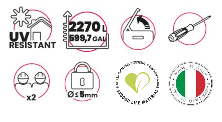 OBJEM 2 270 L: S kapacitou až 2 270 L můžete uskladnit veškeré zahradní nářadí, nábytek nebo dokonce hračky, čímž si udržíte svou zahradu v dokonalém pořádku a bez nepořádku.