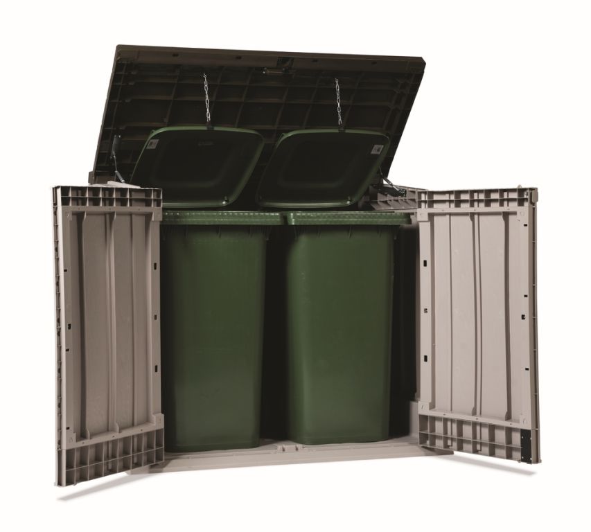 SNADNÉ OTEVÍRÁNÍ A PŘÍSTUP: S nesmírně praktickými dvoukřídlými dveřmi a otevíracím víkem, které lze ovládat snadno a hladce díky pístům (vzduchovým vzpěrám), se dostanete ke svému vybavení během okamžiku. Přístup do skříně je navíc ještě usnadněn šikmým prahem, který umožňuje snadné uskladnění například popelnic nebo jiných předmětů.