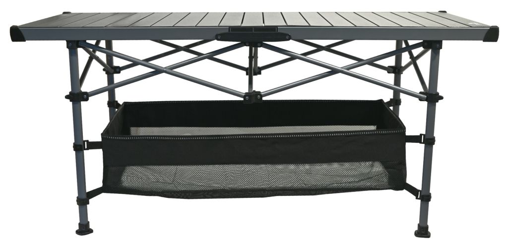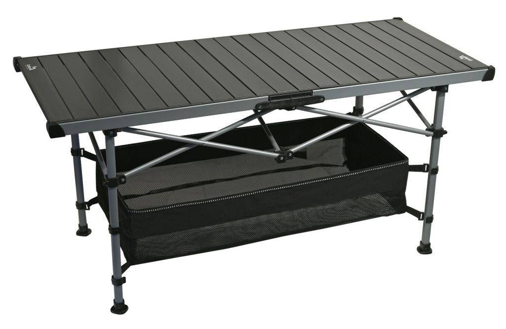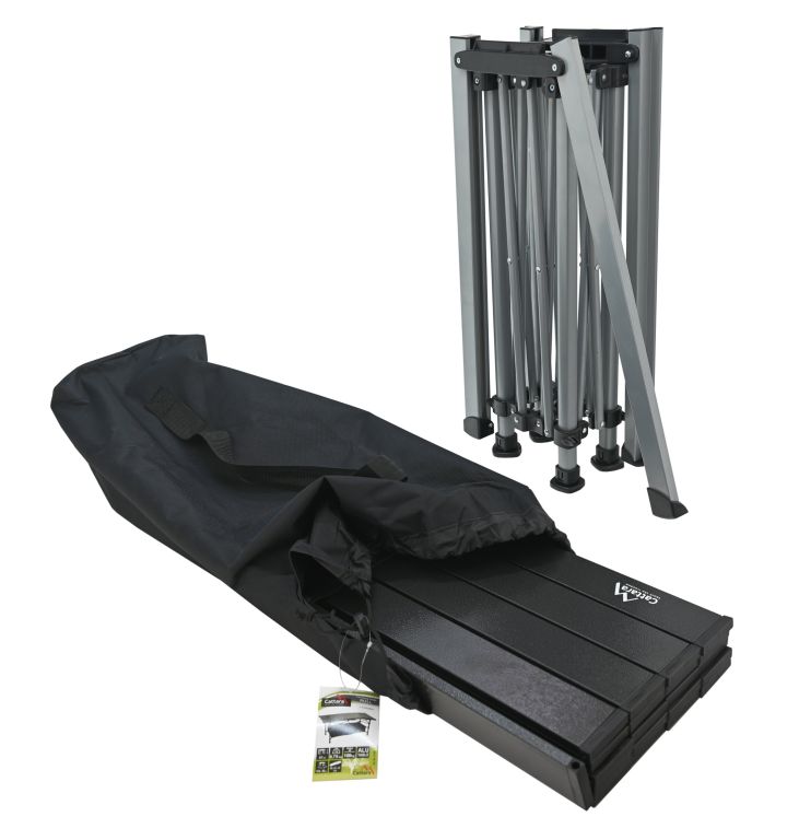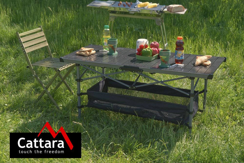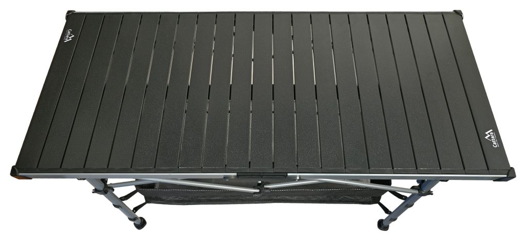 Stůl je opatřen lamelovou Alu plochou s rozměry 123 x 55 cm ve výšce 57 cm (* může být na rovném povrchu navýšeno až o 5 cm) a nabízí maximální nosnost až pro 100kg vybavení, potravin apod.