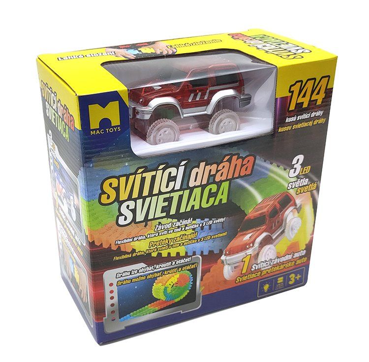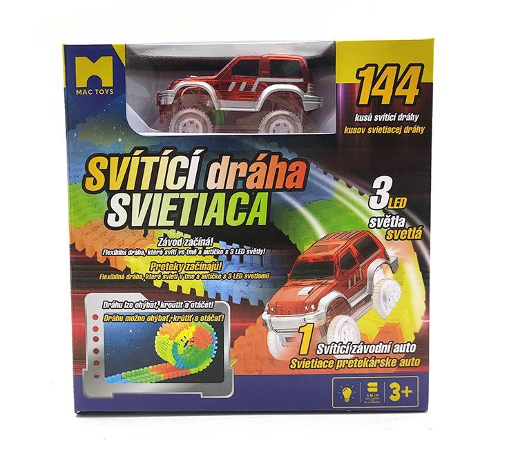 Máte doma budoucího závodníka, kaskadéra, šikovného mechanika či návrháře tratí? Svíticí autodráha Mac Toys je určena pro všechny malé jezdce i dospělé jedince, kteří ocení důmyslné provedení jednotlivých komponentů a také nostalgii spojenou s dětskou hrou. Sada rovněž obsahuje auto se 3 LED diodami, které v přítmí udělají barevný světelný efekt, a s napájením pomocí 1 AA baterie, která není součástí této dodávky. Trať ve tmě krásně fosforeskuje, což dodá hře jedinečnou nezaměnitelnou atmosféru. Navíc je natolik flexibilní, že ze 144 dodávaných dílků vaše dítko dokáže postavit okruh libovolného tvaru. Stavba autodráhy podporuje dětskou kreativitu a samotné hraní s autíčky rozvíjí koordinaci rukou a očí, které vaše dítě jistě využije na své cestě životem. Tato herní sada rovněž motivuje děti k překonávání rozličných životních překážek, takže se s ní lépe naučí zvládat negativní emoce, jako je smutek nebo frustrace. Vaše ratolest se tak na trati nejenom vyřádí, ale také se mnohému přiučí.