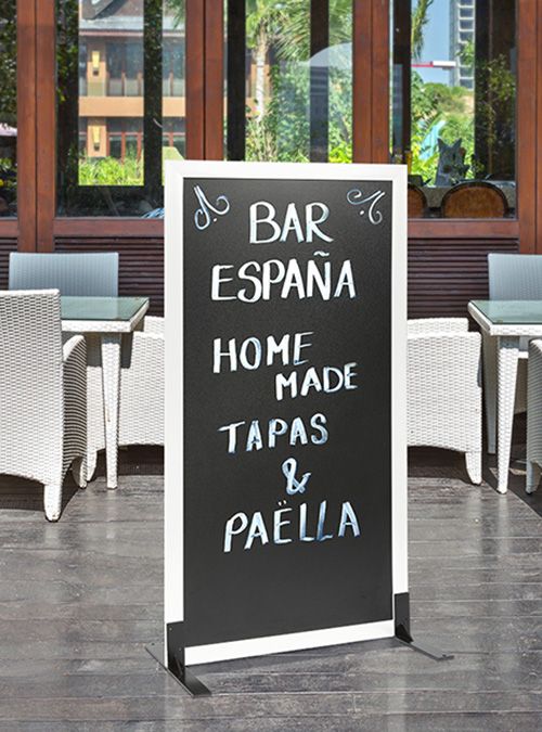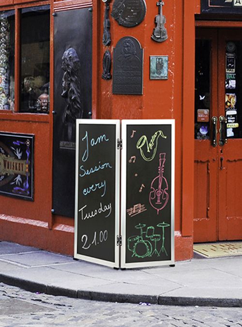 Lehká oboustranná tabule patří mezi spojovatelné reklamní cedule. Jednoduchý obdélník má perfektní povrch pro popisování křídovými fixami bez poškrábání a i při plném slunci zůstane barva tmavá. Rám černé barvy z pevného plastu odolává povětrnostním vlivům slunce a deště a zaručuje dlouhou životnost. Černou popisovatelnou desku snadno omyjete vodou nebo čističem. Tabuli lze postavit na podlahu pomocí opěrných podstavců, které nejsou součástí balení. Pomocí přiložených pantů a gumových patek obdélníky snadno spojíte dohromady pro obestavění sloupů a kmenů stromů. Můžete s ní obložit rohy a vytvořit celé panelové stěny. Lze ji pověsit na stěnu ve svislé nebo vodorovné poloze.
