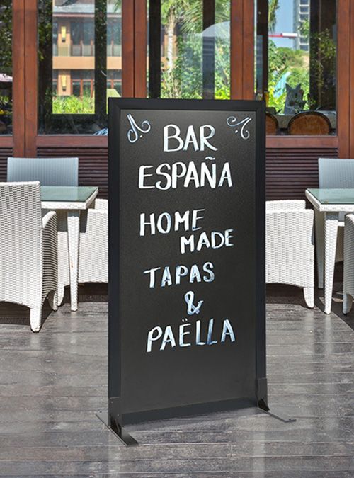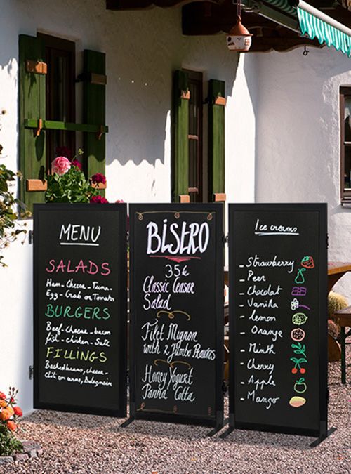 Lehká oboustranná tabule patří mezi spojovatelné reklamní cedule. Jednoduchý obdélník má perfektní povrch pro popisování křídovými fixami bez poškrábání a i při plném slunci zůstane barva tmavá. Rám černé barvy z pevného plastu odolává povětrnostním vlivům slunce a deště a zaručuje dlouhou životnost. Černou popisovatelnou desku snadno omyjete vodou nebo čističem. Tabuli lze postavit na podlahu pomocí opěrných podstavců, které nejsou součástí balení. Pomocí přiložených pantů a gumových patek obdélníky snadno spojíte dohromady pro obestavění sloupů a kmenů stromů. Můžete s ní obložit rohy a vytvořit celé panelové stěny. Lze ji pověsit na stěnu ve svislé nebo vodorovné poloze.