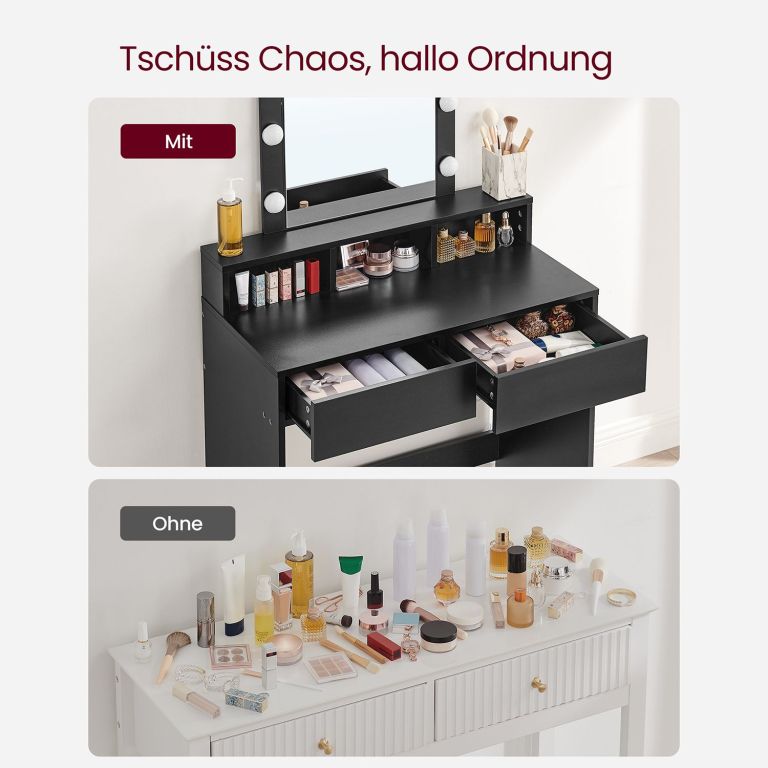 Proměňte každodenní líčení v zážitek díky modernímu toaletnímu stolku s LED osvětlením. Devět nastavitelných světel vám umožní najít ideální jas pro dokonalý make-up, zatímco promyšlené úložné prostory udrží vše přehledně na svém místě. Elegantní černý design skvěle doplní každý interiér a stane se vaším oblíbeným koutkem krásy.