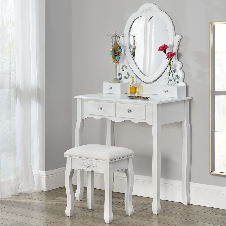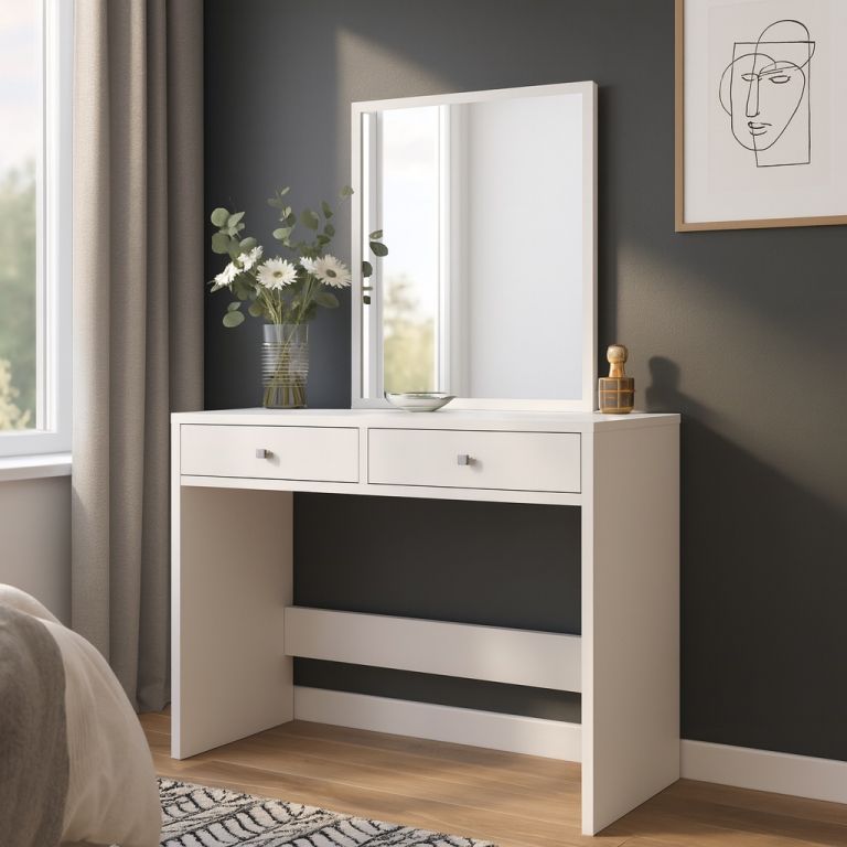 Vytvořte si doma svůj vlastní kosmetický koutek, kde se každé ráno budete cítit jako v profesionálním studiu. Bílý toaletní stolek se zrcadlem a LED osvětlením dodá ložnici či šatně jemnou eleganci a praktické místo pro každodenní péči o sebe. Dvě zásuvky uschovají kosmetiku, štětce a drobné doplňky, zatímco široká plocha stolu poskytne pohodlný prostor pro líčení.