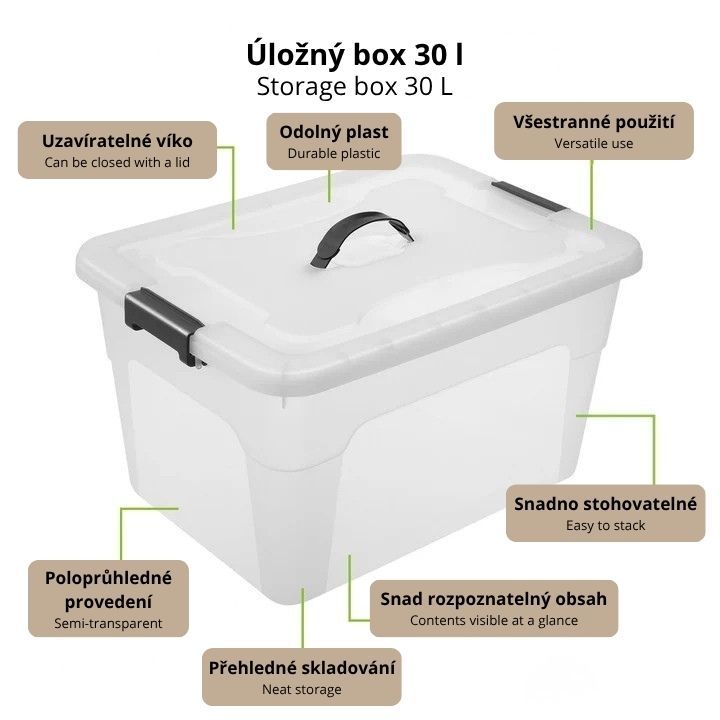 Zobrazit podrobnější popisPraktické boxy s víkem a objemem 30 litrů využijete na textil, hračky, knihy i sezónní dekorace. Snadno se přenášejí a dají se skládat na sebe.