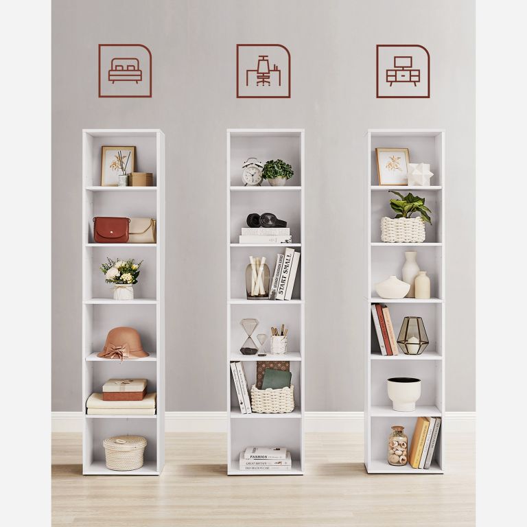 Vytvořte si útulný koutek pro knihy, dekorace i květiny díky této úzké knihovně v čistě bílé barvě. Jednoduchý skandinávský styl se hodí do každého interiéru a pomůže vám udržet domov přehledný a vzdušný.