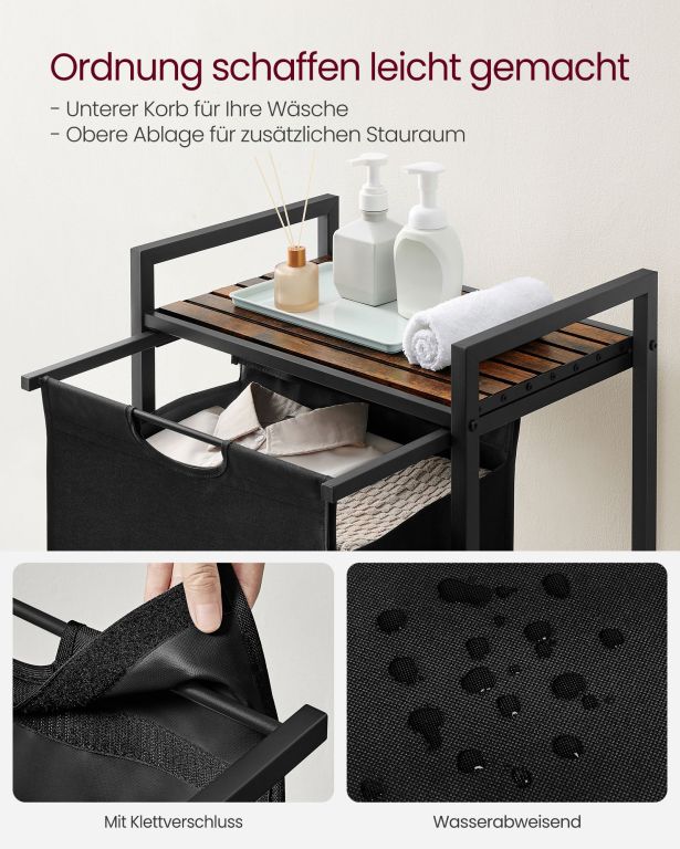 Rám z ocelových trubek 2 cm a MDF zajišťují stabilitu; police unese až 20 kg. Vložka z vodoodpudivého Oxfordu má plastové dno proti prověšení. Díky suchému zipu ji snadno vysunete a odnesete k pračce. Seřiditelné nožky doladí stabilitu i na nerovné podlaze.