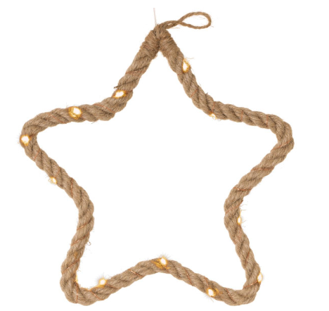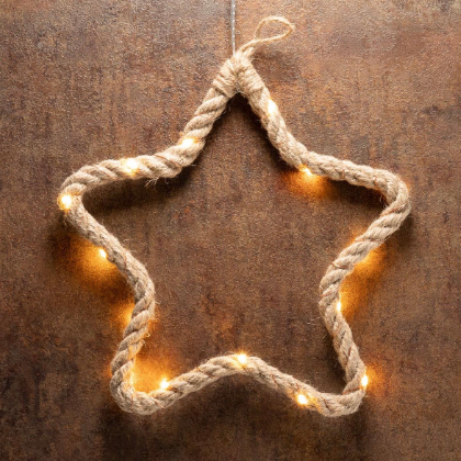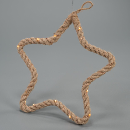 Praktická vánoční dekorace ve tvaru hvězdy z konopného provazu omotaného stříbrným drátem, vybavená 15 teplými bílými LED diodami k zavěšení/dekoraci.