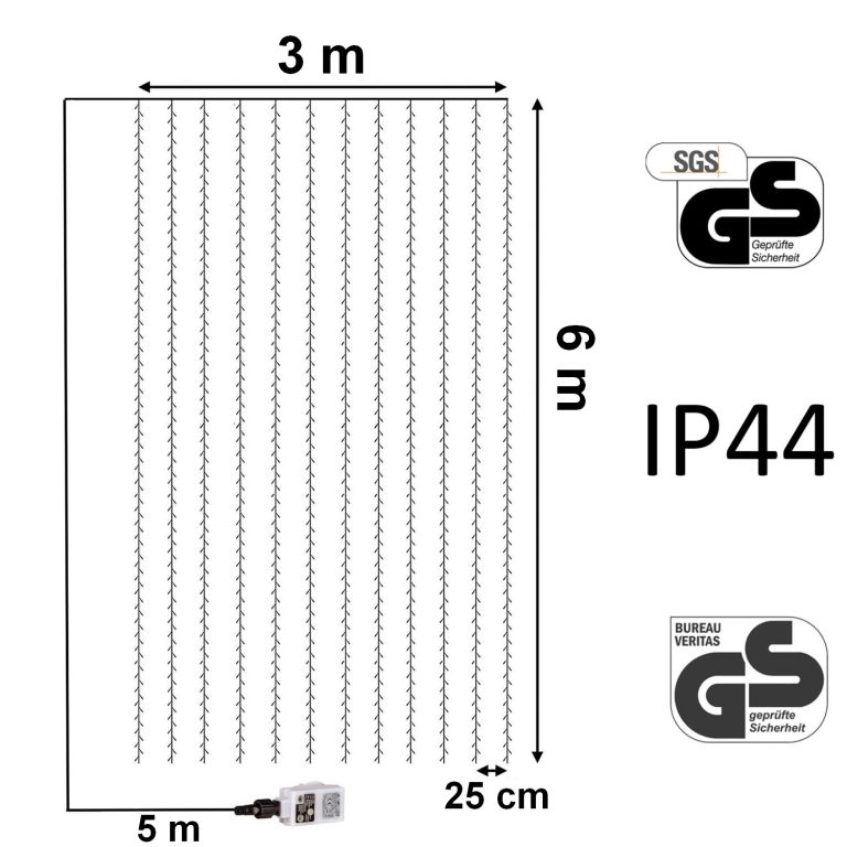 Světelný závěs je opravdu univerzálním osvětlením pro Vaši domácnost. Můžete ho umístit do okna, na dveře, mezi dveře, nebo jen tak na zeď. A co je nejlepší? Že ho nemusíte použít pouze o Vánocích, ale i kdykoliv během roku. LED diody nevytvářejí teplo nebo UV záření. Spotřeba elektrické energie je v porovnání s žárovkami extrémně nízká (až 90% úspor). Životnost LED je až 100 000 hodin a daleko přesahuje životnost normální žárovky (v závislosti na výkonu asi 1000 hodin). U světelných řetězů VOLTRONIC byla kladena nejvyšší hodnota na bezpečnost, a proto byly jak světelné řetězy (Bureau Veritas) a adaptér certifikovány (SGS) GS (testovaná bezpečnost). Součástí osvětlení je i dálkové ovládání, díky kterému osvětlení na dálku nejen zapnete a vypnete, ale zároveň můžete nastavit časovač (osvětlení bude 6 hodin poté vždy svítit a 18 hodin "spát"), nebo využít možnosti zvýšení nebo snížení jasu. Na adaptéru najdete možnost nastavení až 8 světelných funkcí: různé kombinace, svícení ve vlnách, sekvenční svícení, pomalá záře, rychlé blikání, pomalé slábnutí, jiskřivé blikání, stálé svícení.