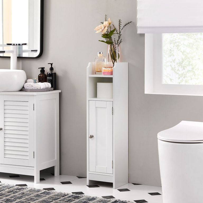 Praktická koupelnová skříňka VASAGLE v bílé barvě šetří místo, nabízí dostatek úložného prostoru a snadno se montuje.
