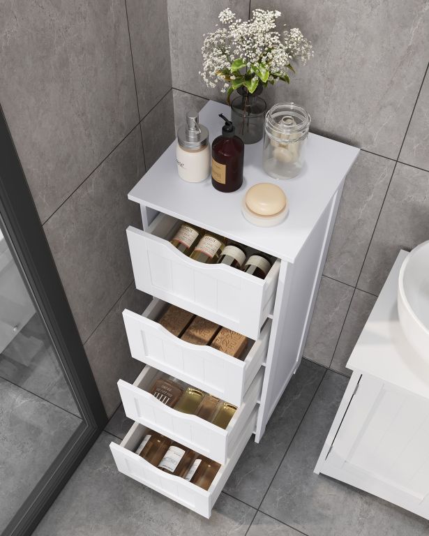 Elegantní koupelnová skříňka VASAGLE se 4 zásuvkami šetří místo, nabízí stabilitu a přidává moderní styl do vašeho interiéru.