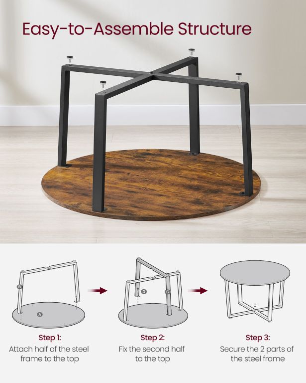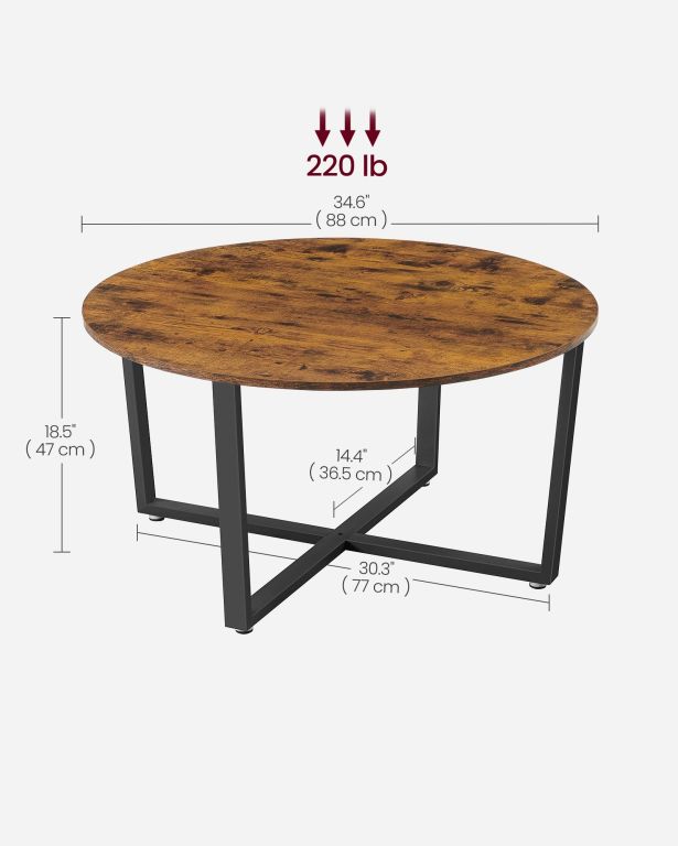 Stylový kulatý konferenční stolek VASAGLE v industriálním designu, stabilní kovová konstrukce, snadná montáž a rustikální povrch.