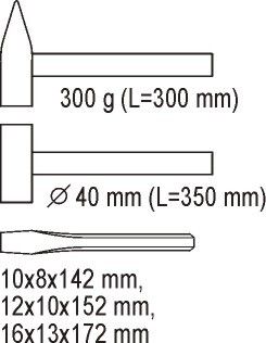 Sada 5 kusů kladiv a dlát z CrV oceli. Sada je přehledně srovnána ve vložce do zásuv...