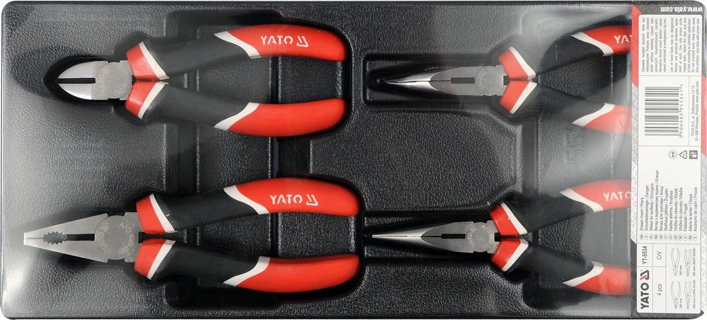 Sada 4 kusů kleští z CrV oceli. Kleště jsou přehledně srovnány ve vložce do zásuvky z PVC.