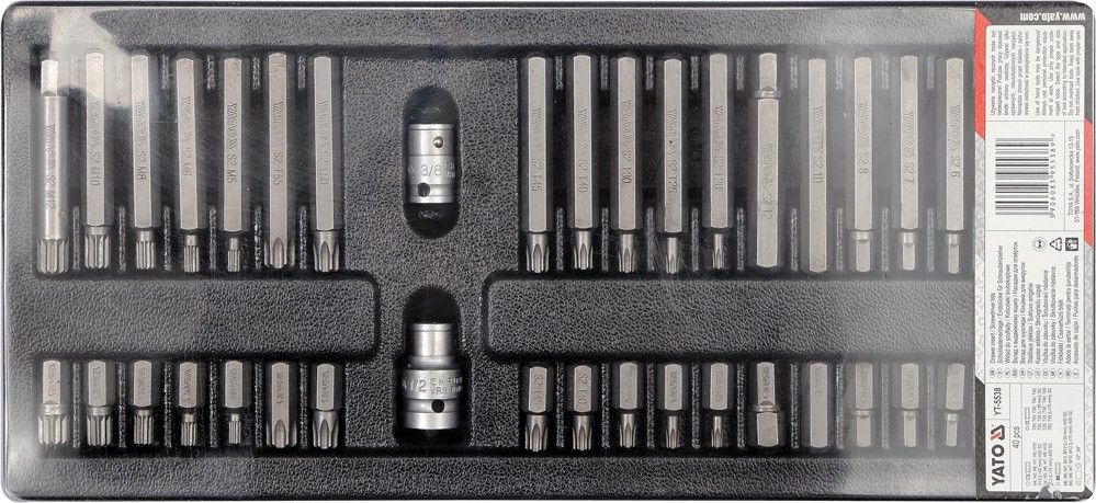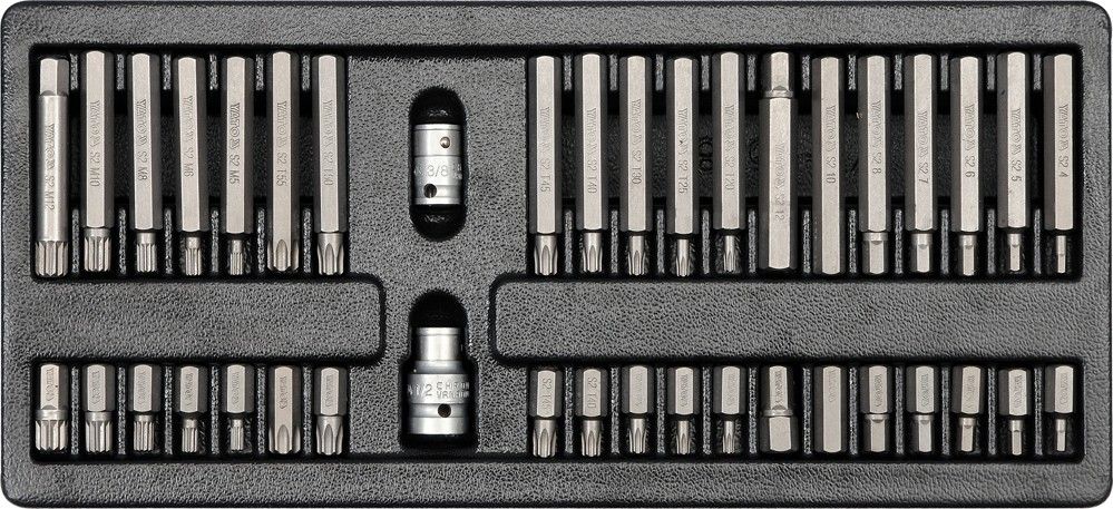 Sada 40 kusů bitů z CrV oceli. Sada bitů je přehledně srovnána ve vložce do zásuvky z PVC.