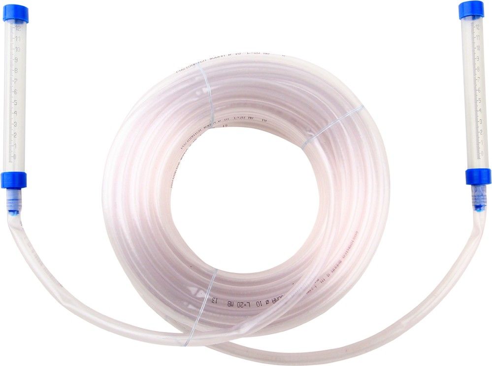 Vodní vodováha 20 m dlouha, je určena k vyrovnání vzdálených bodů. Měřicí válce s čitelnou stupnicí vyrobené z nerozbitného plastu. Těsné zátky zabraňují odtoku vody v místě měření. Obzvláště užitečné při určování úrovní na velké vzdálenosti ve stavebnictví, pro zednické a zemní práce, např. pro vyrovnávání oken nebo parapetů v sousedních místnostech.
