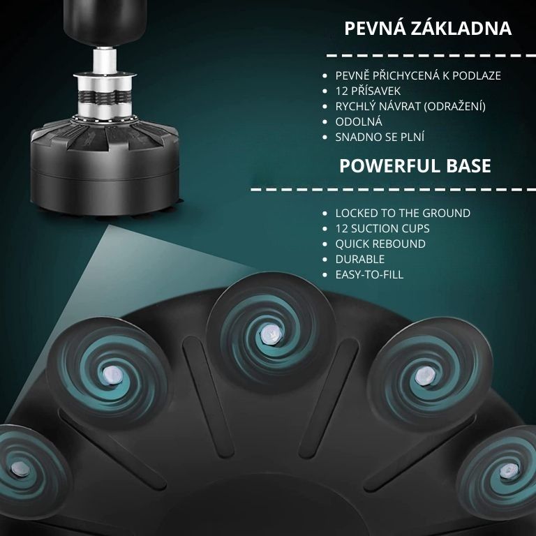 Trénink kdykoli a kdekoli – volně stojící boxovací pytel s 12 přísavkami zajistí stabilitu i bez montáže.