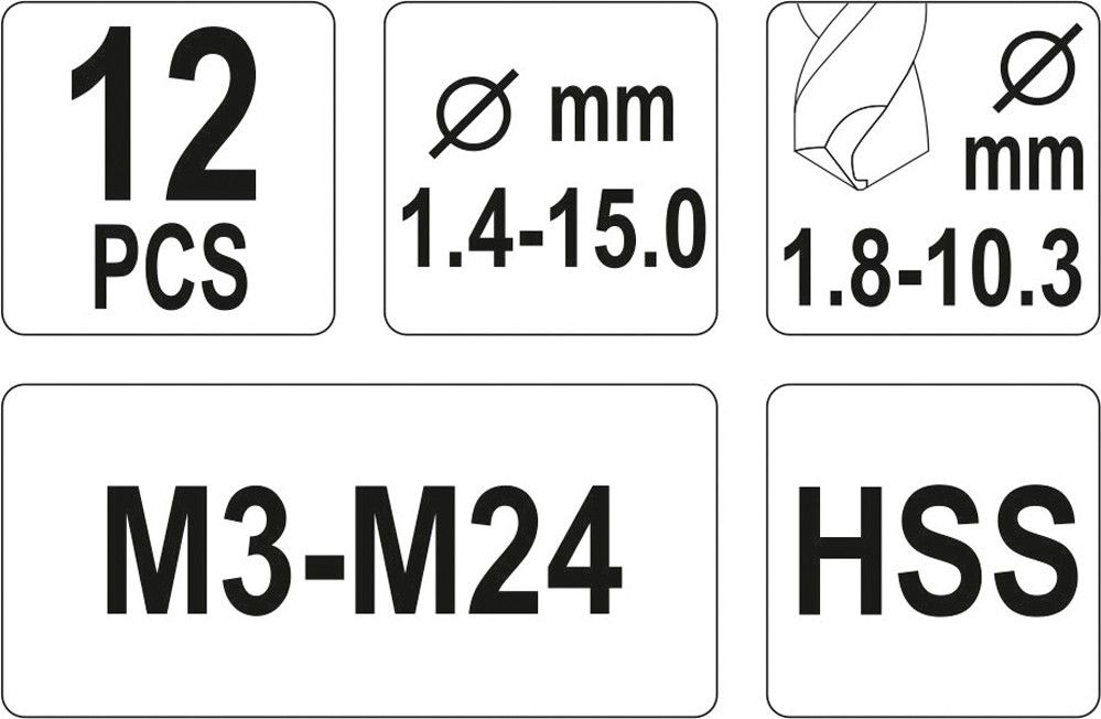 Sada obsahuje 6 kusů vrtáků a 6 kusů levotočivých vytahovačů pro závity M3 - M24.