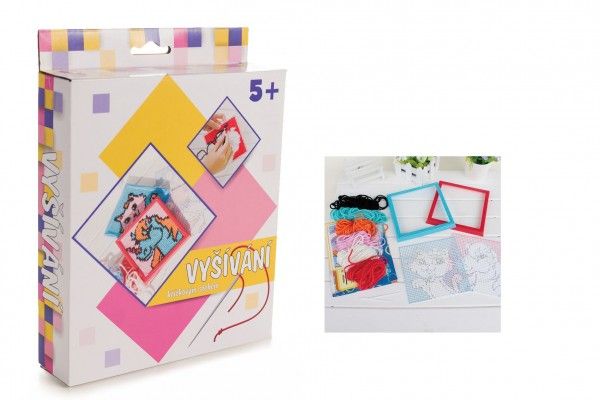 Děti si mohou křížkovým stehem vyšít dvě předtištěné předlohy, dále balení obsahuje 2 umělé jehly, 2 plastové rámečky, 6 barevných bavlnek a návod.t