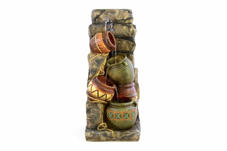 Krásná osvětlená kašna, vhodná jak na zahradu tak do obývacího pokoje či terasu. Součástí kašny jsou led diody, které umístíte do jednotlivých džbánků - poté fontána vyzařuje příjemné teplé světlo. Kašna má tichý chod. Kašna je vyrobena z polyresinu, který je jednou z forem pryskyřičných materiálů, které jsou skvěle odolné proti povětrnostním podmínkám.