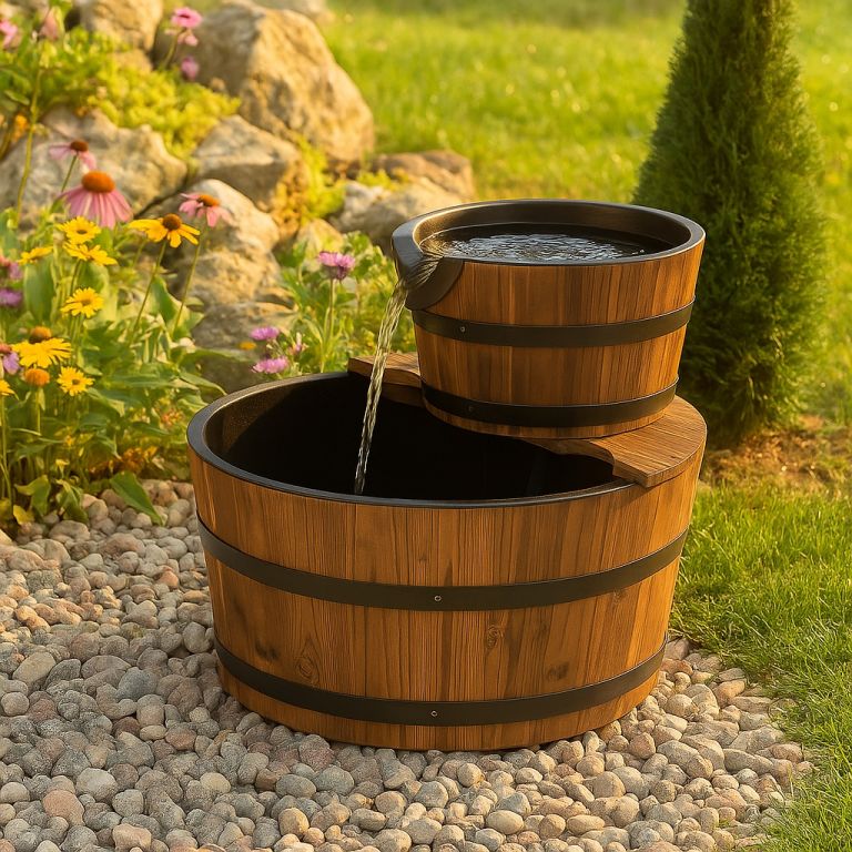 Vysoce kvalitní zpracování - vyrobeno z masivního pravého dřeva, odolné proti povětrnostním vlivům. Krásná zahradní dekorace ze dřeva dodá Vaší zahradě punc originality. Originální, cca 40 cm vysoká kašna rozzáří vaši zahradu. Skládá se ze dvou věder s průměrem 44 cm a 29 cm.