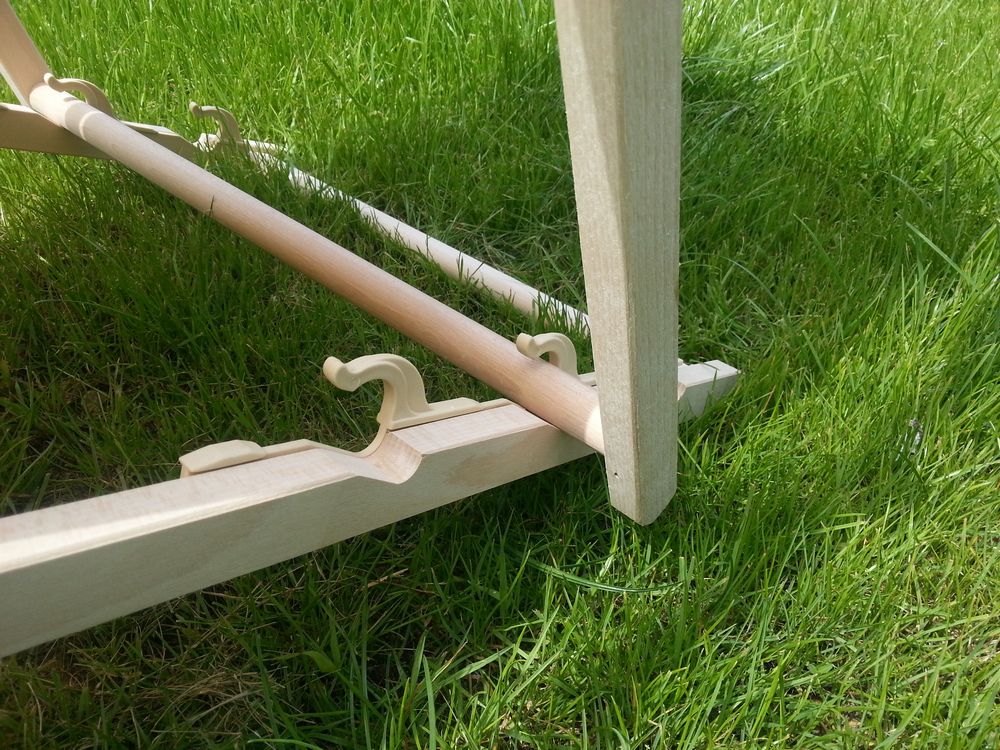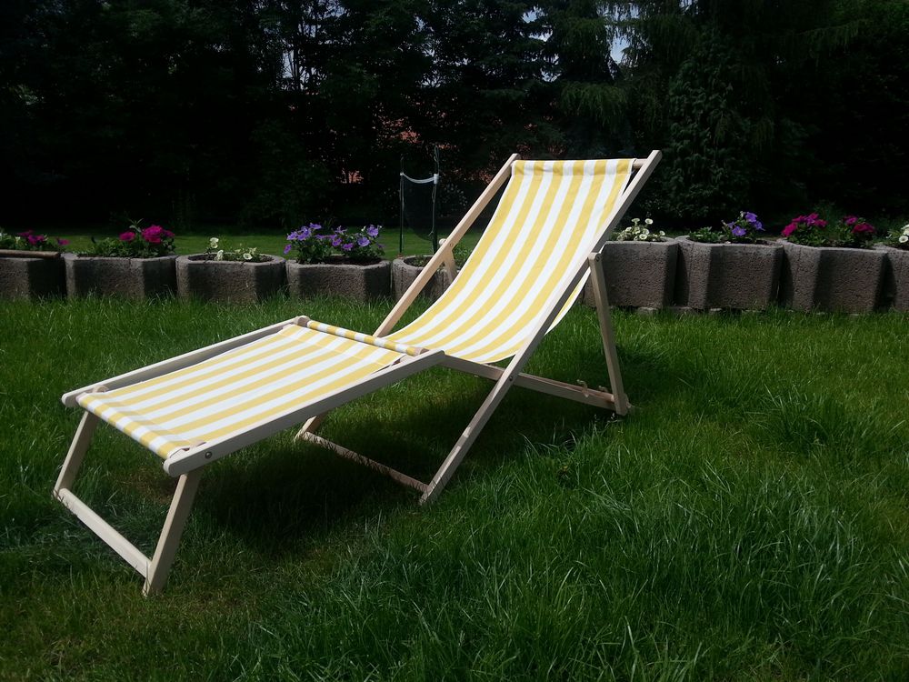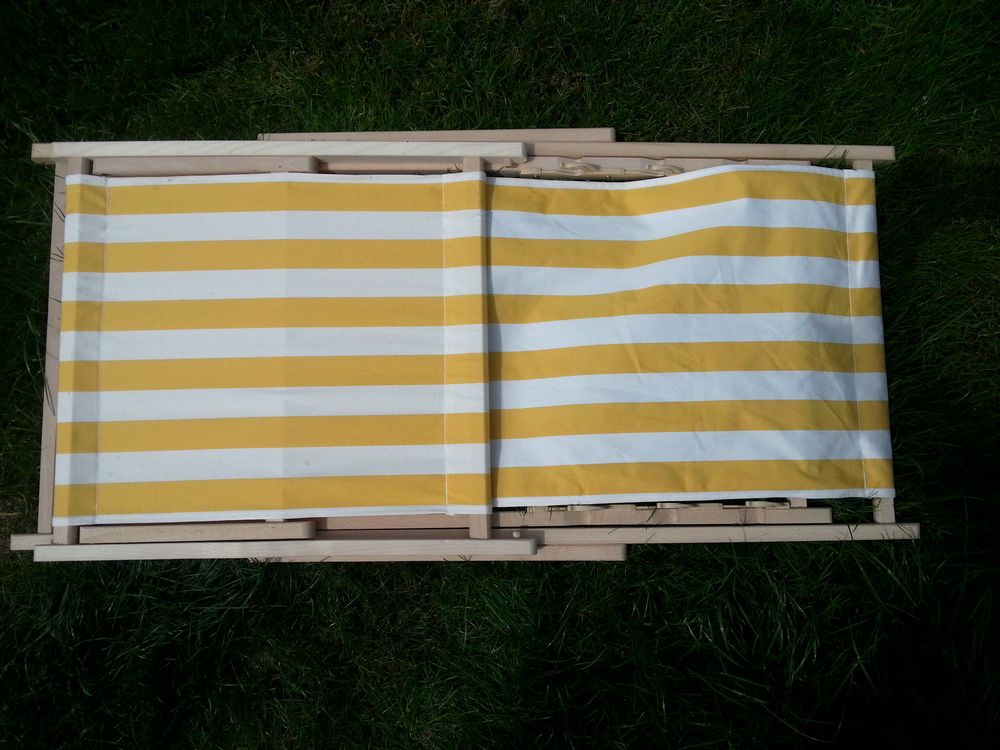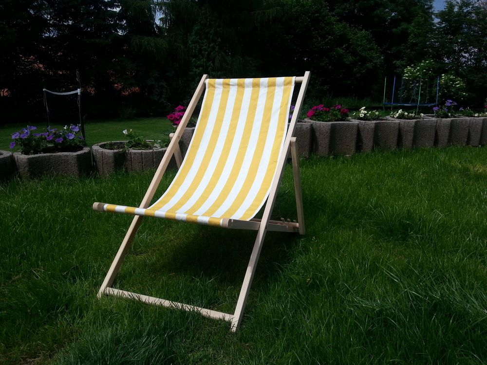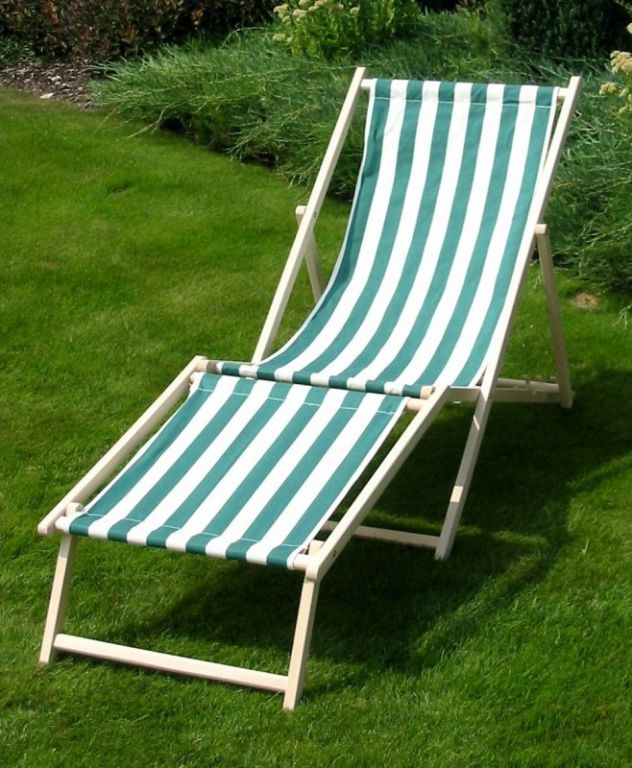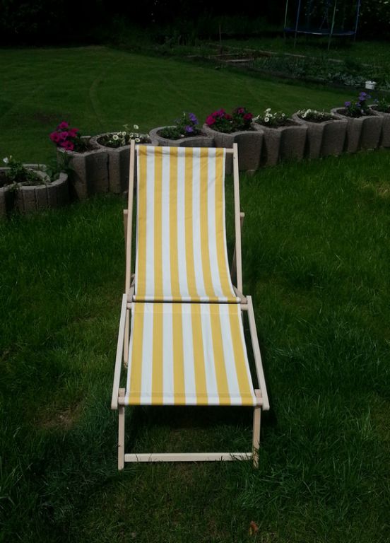 Zahradní lehátko z pevné látky a z borovicového dřeva. Snadno skládatelné a dobře skladovatelné. Vhodné k bazenům, na zahradu či na balkon. Povrch je vhodné ošetřit např. mořením, nebo napuštěním voskem, olejem, neboť je bez povrchové úpravy.