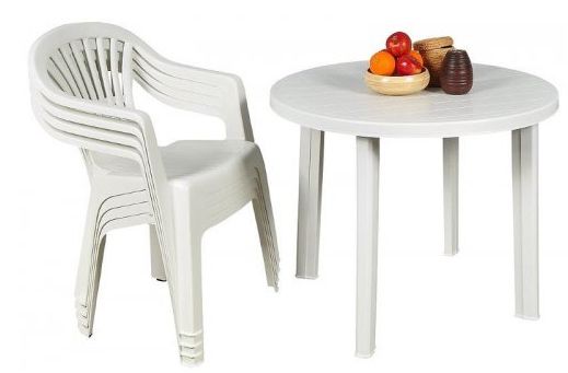 Jedná se o klasický zahradní set z plastu, obsahující stůl a čtyři židličky, který se hodí na každou zahradu či terasu.