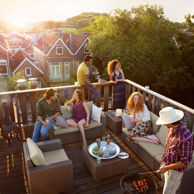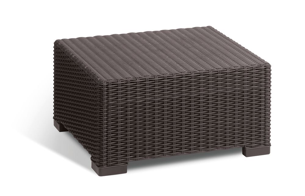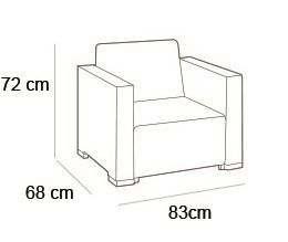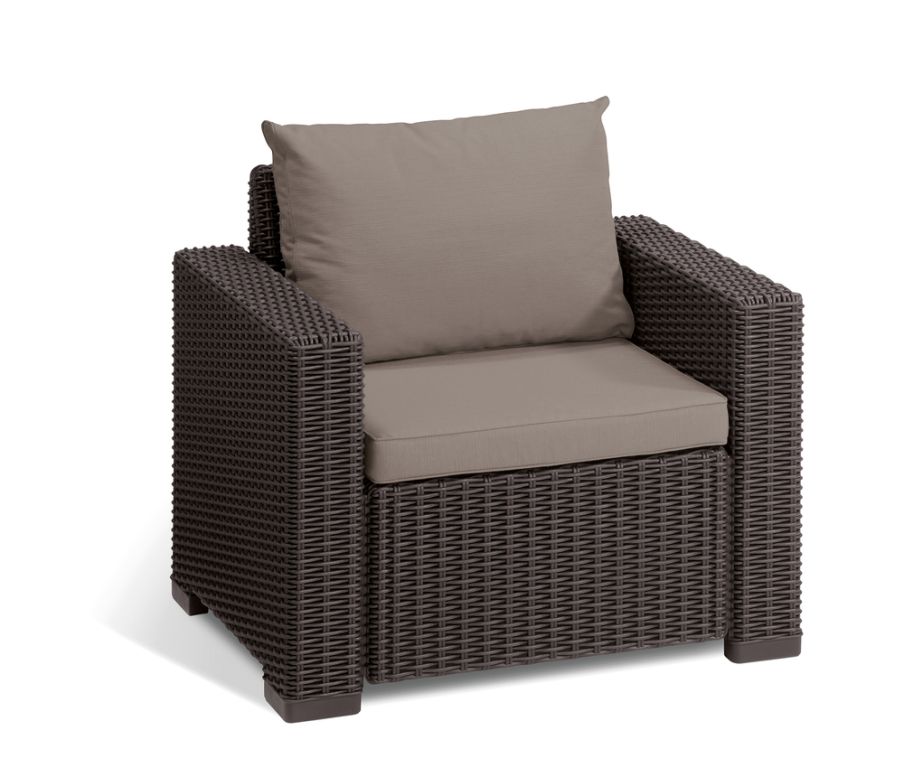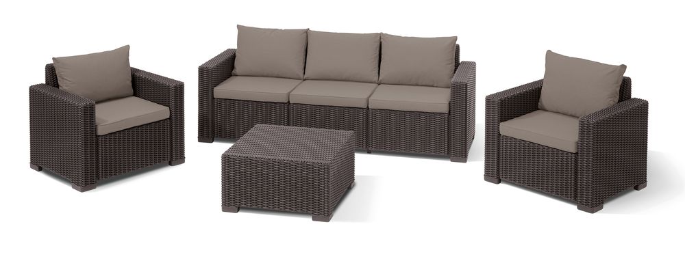 California je pohodlné a moderní posezení jak ven, tak do interiéru. Souprava je vyrobena z lisovaného plastu v imitaci kulatého ratanu. Set je doplněn o podušky, které zajistí ještě větší pohodlí. Skládá se ze dvou křesílek, sofa pro 3 osoby a stolku. Jednoduchá montáž i údržba. Set je odolný nepřízni počasí i UV záření.
