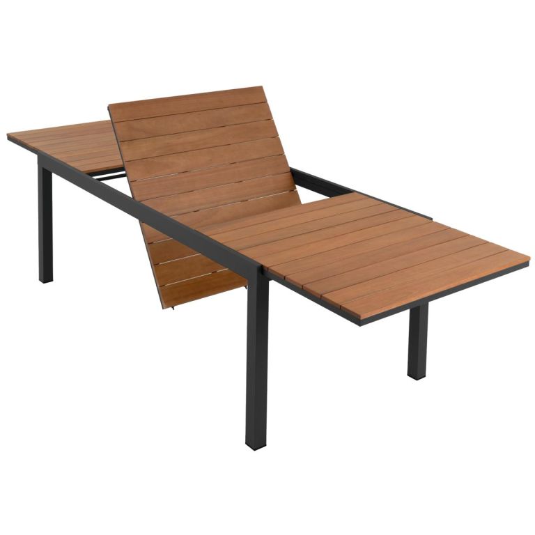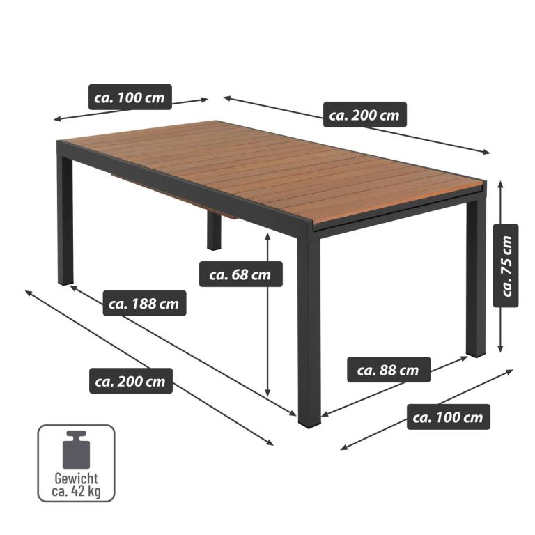 Kvalitní, stylový, snadno udržovatelný, obdélníkový, rozkládací a masivní stůl s deskou z eukalyptového dřeva v moderním designu a hliníkovým rámem je precizně a čistě zpracovaný a nabízí dostatek prostoru pro talíře, hrníčky, misky, dorty, podnosy, svačiny... nebo cokoli, co chcete svým hostům nabídnout. Lze jej rychle rozložit v několika krocích a nabízí tak prostor pro 8 osob. Perfektní pro relaxaci nebo zábavu hostů, na zahradě, na balkoně, terase nebo lze použít jako kuchyňský nebo jídelní stůl.