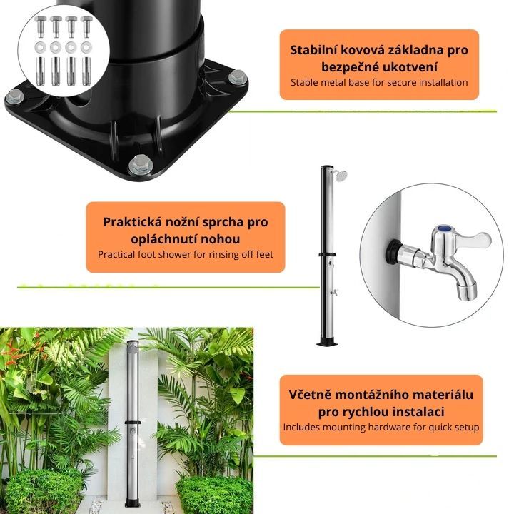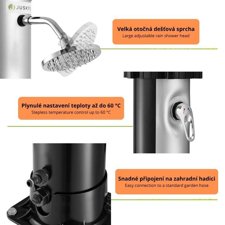 Sprcha je vybavená 40litrovou nádrží, velkou otočnou dešťovou hlavicí a plynulou regulací teploty až do 60 °C. Ve spodní části najdete také praktickou nožní sprchu, kterou lze využít nejen k opláchnutí nohou před bazénem, ale i k napouštění konve nebo kbelíku. Stabilní kovová základna umožňuje pevné ukotvení k podkladu a připojení vody je řešené přes běžnou zahradní hadici. Konstrukce z PVC doplněná o kovové a ABS prvky je navržená pro venkovní použití během sezóny.