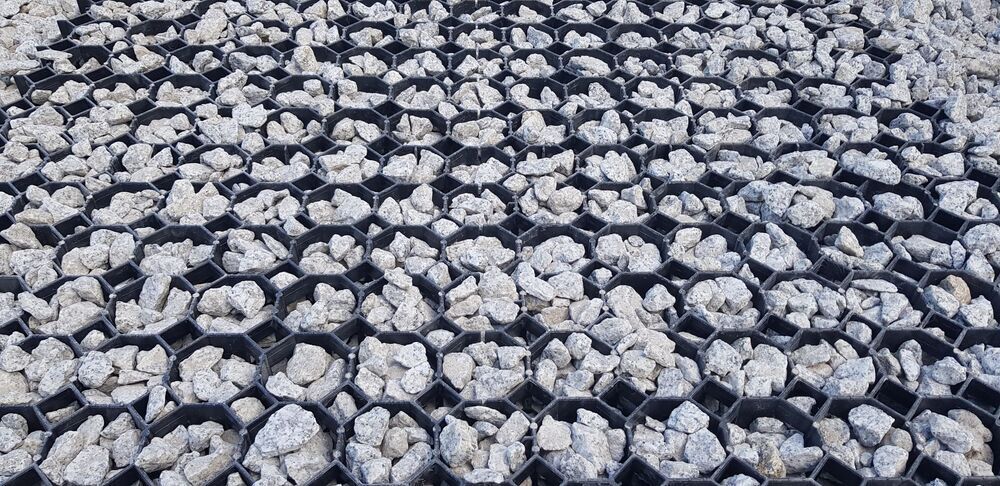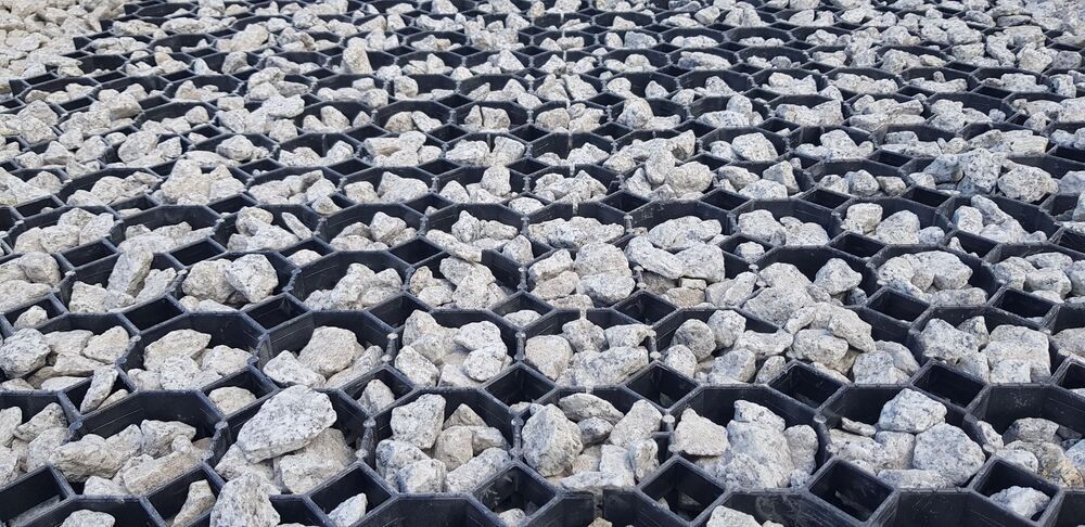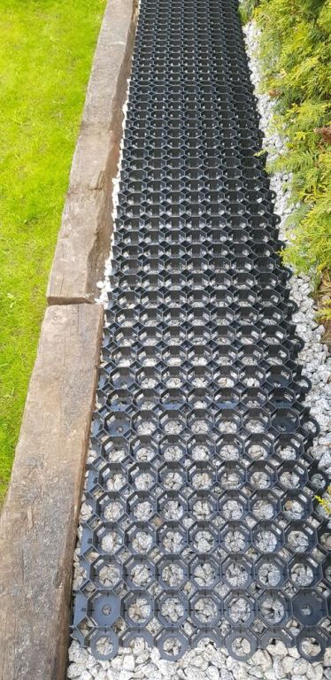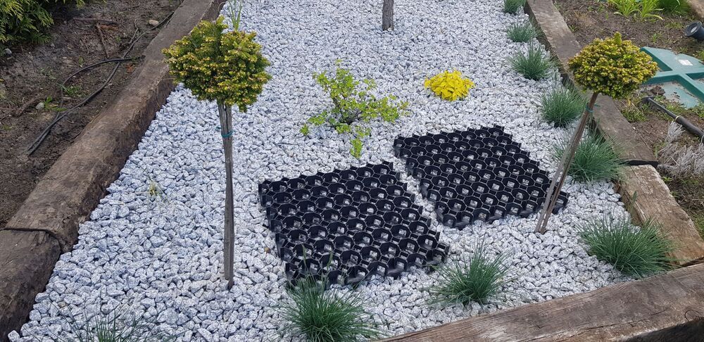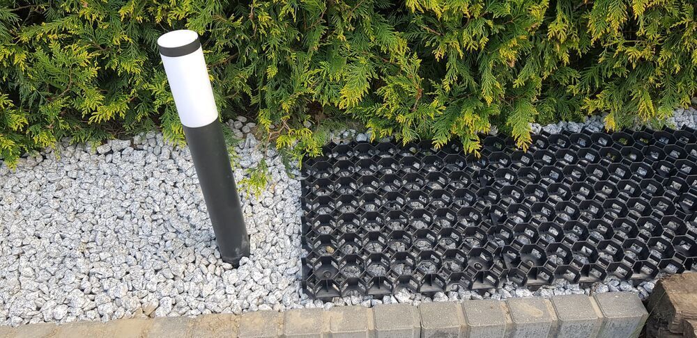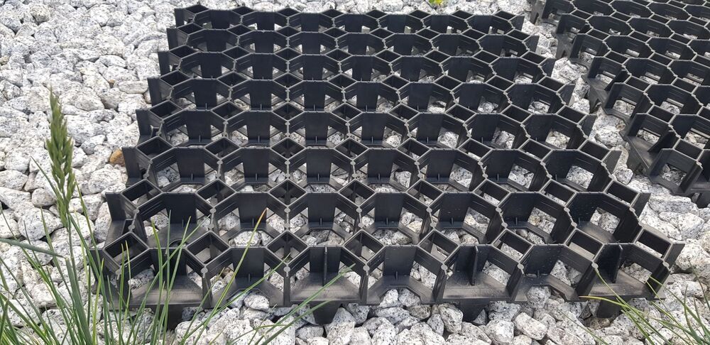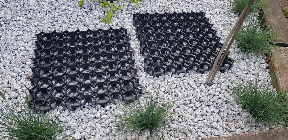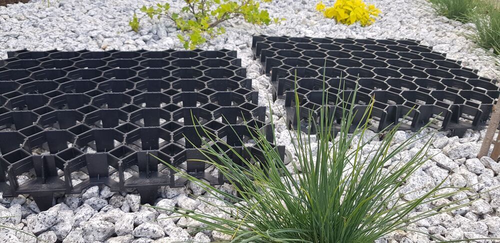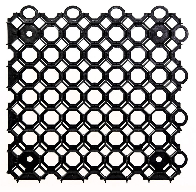 Velkou výhodou tohoto systému je, že umožňuje průsak dešťové vody, čímž podporuje přirozený koloběh vody. Instalace je velmi snadná a lze ji provést svépomocí. Mřížku můžete nechat volně prorůst trávou, nebo ji vyplnit štěrkem či štěrkodrtí dle Vašich preferencí. Každá dlaždice má 4 místa pro případné kotvení, na které je možné využít hřeby pro záhonové obrubníky.