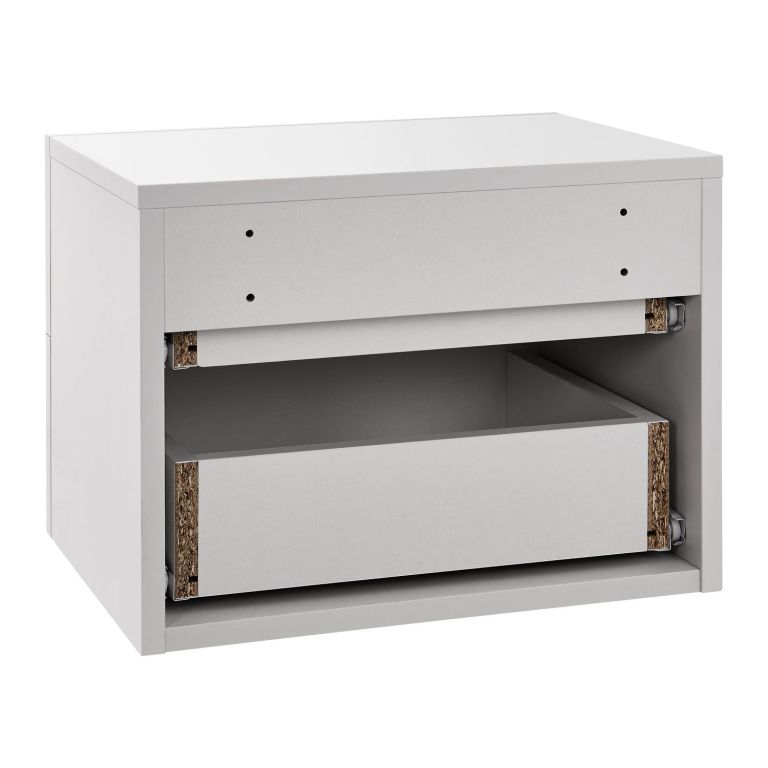 Stolek je vyroben z kvalitní dřevotřísky s odolnou povrchovou úpravou, která zajišťuje snadnou údržbu. Jednoduchá montáž na stěnu šetří místo a umožňuje snadný přístup k úklidu pod stolkem. Dvě zásuvky poskytují dostatek úložného prostoru pro každodenní potřeby.